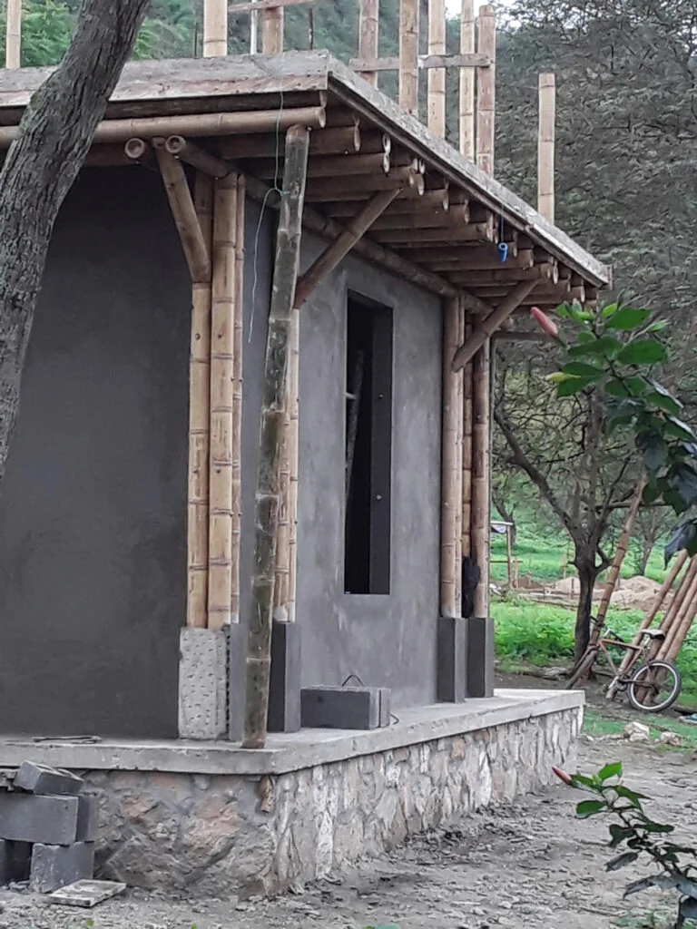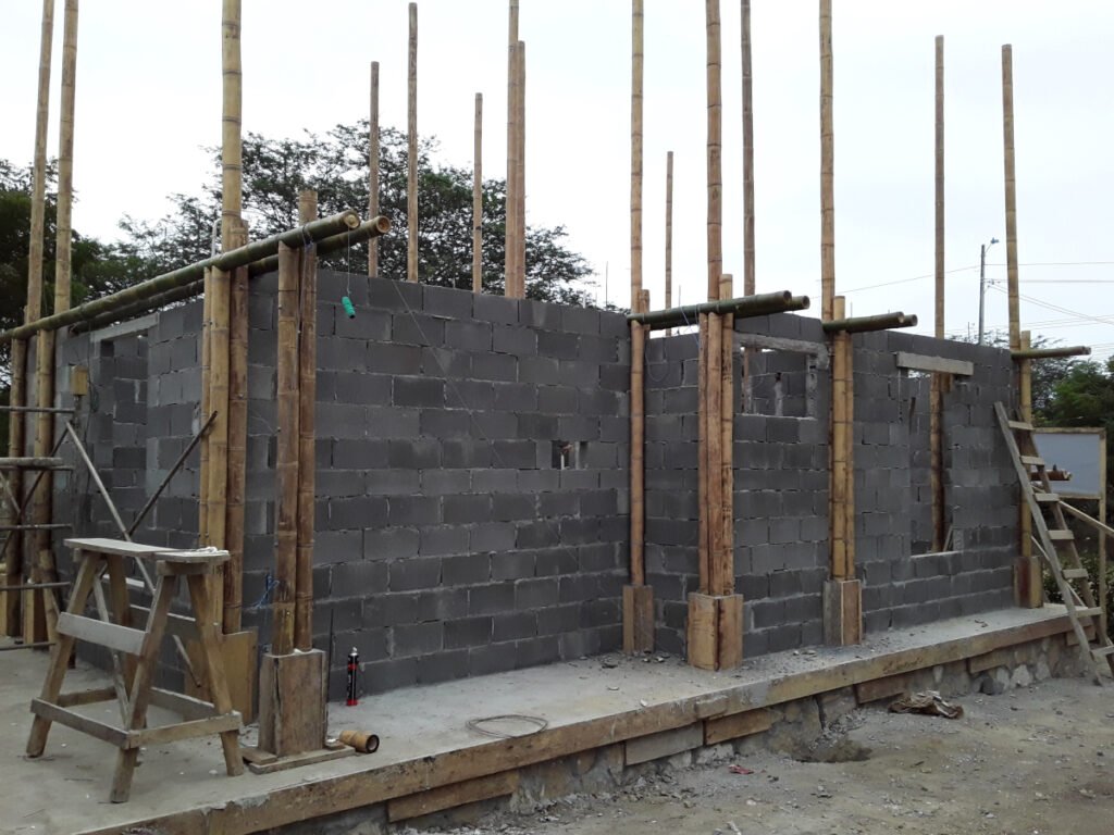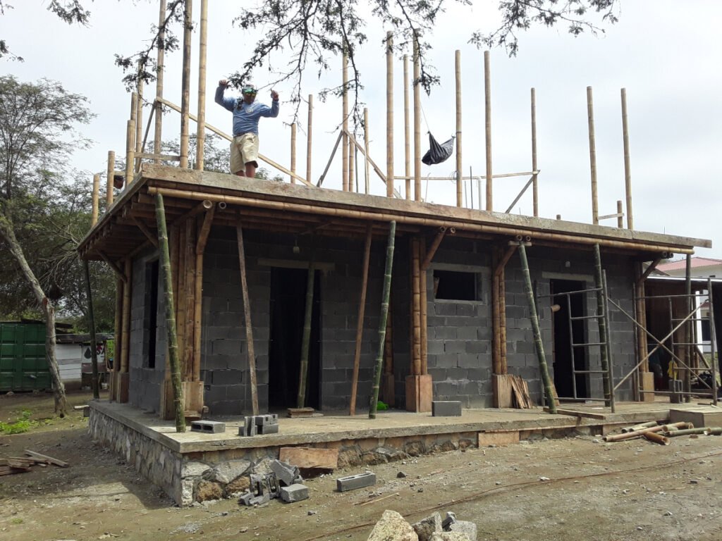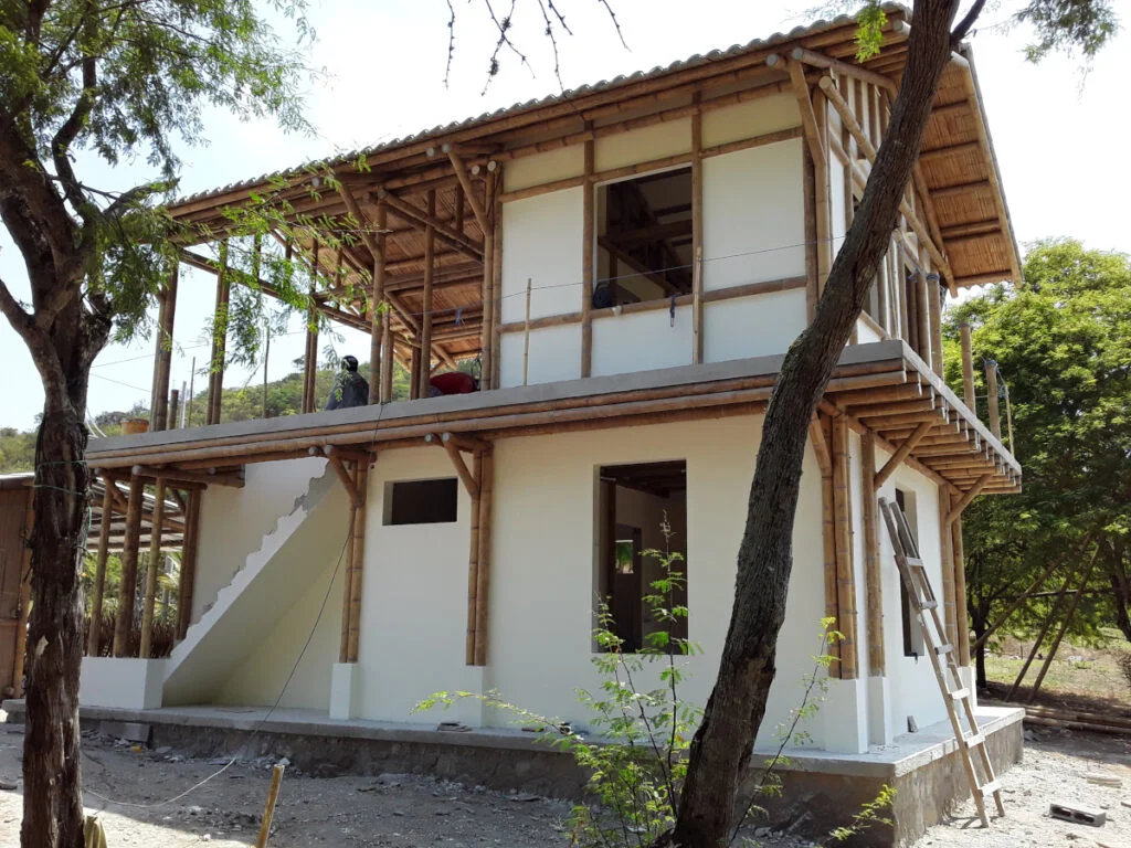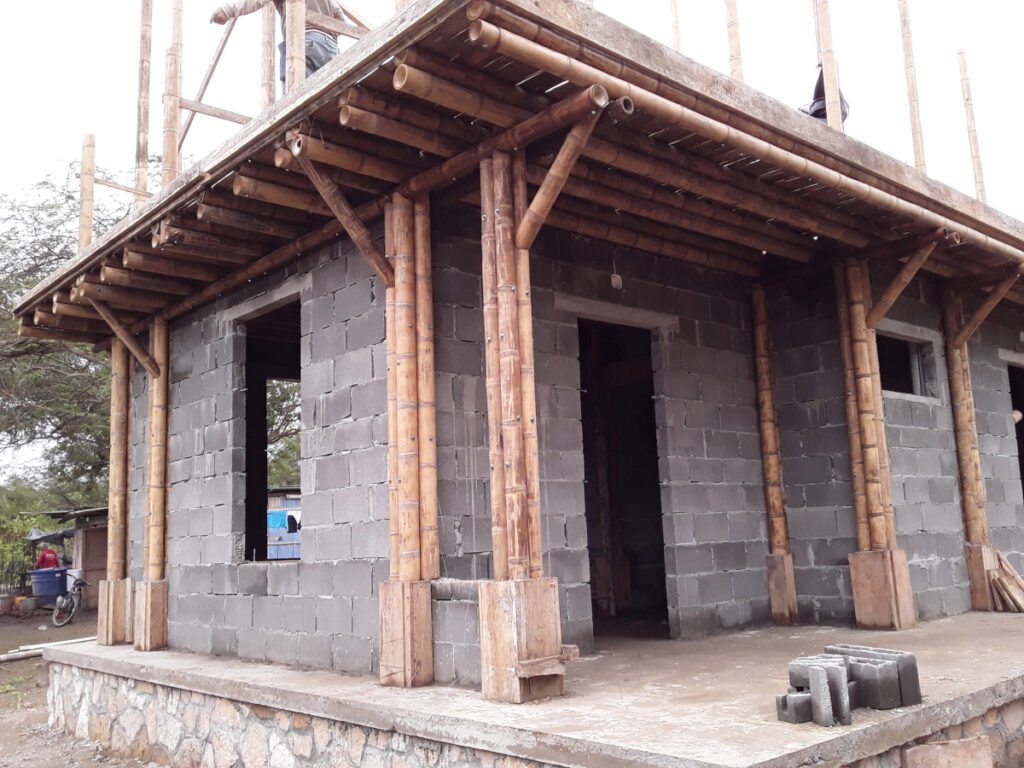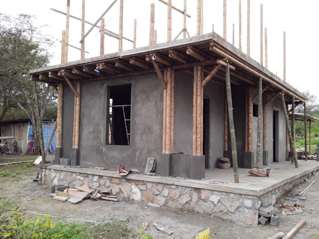 Casa de dos pisos en Bosques de Olón con una estructura de bambú, paredes de bloques (planta baja) y caña picada (segunda planta) enlucido a ambos lados y losas de hormigón armado.