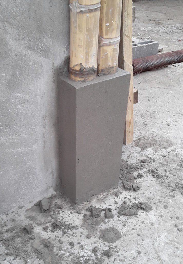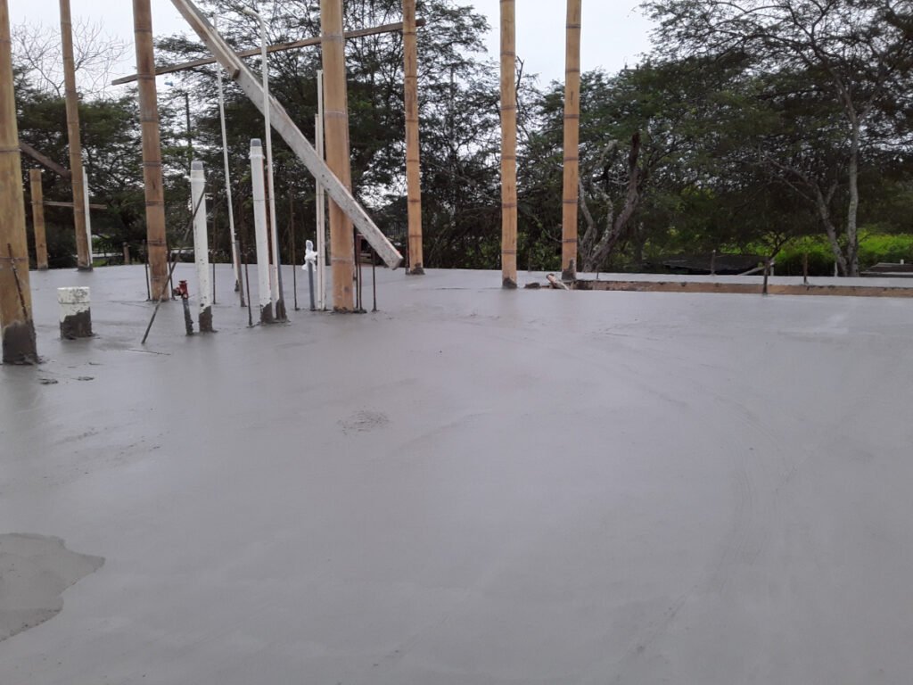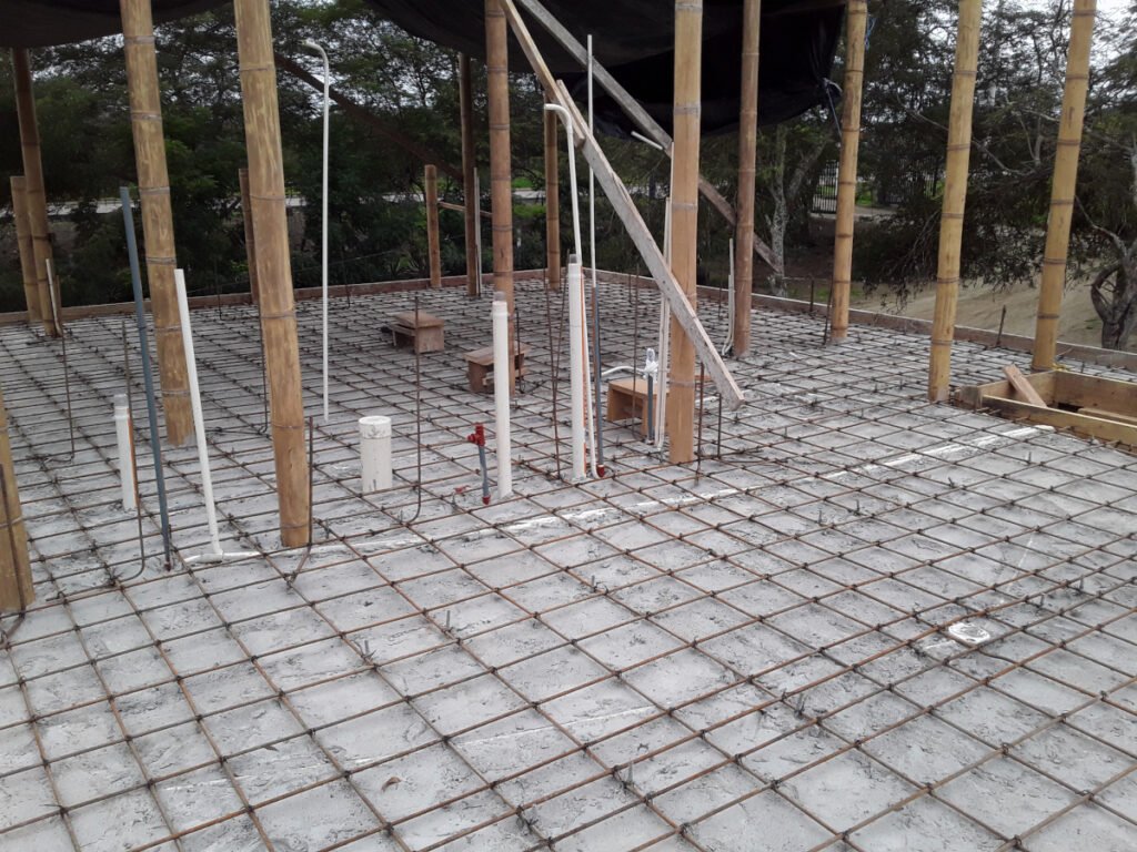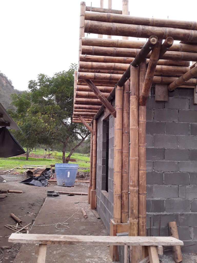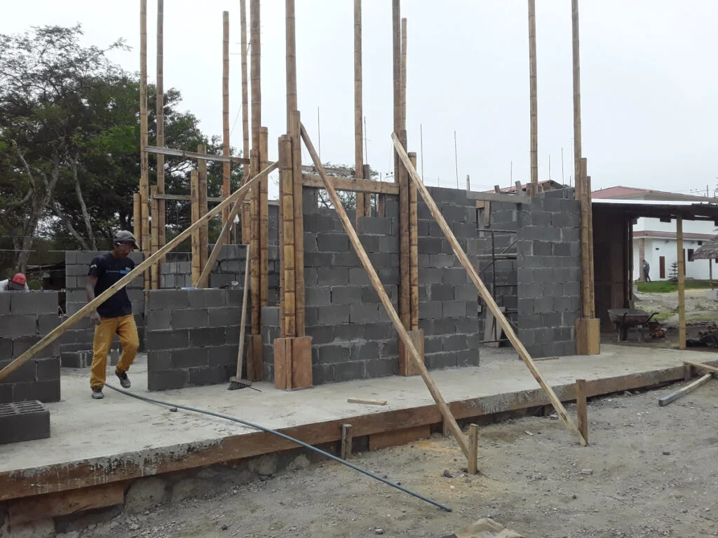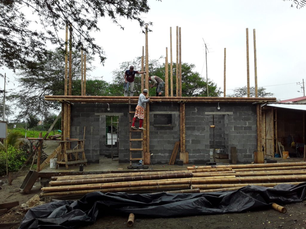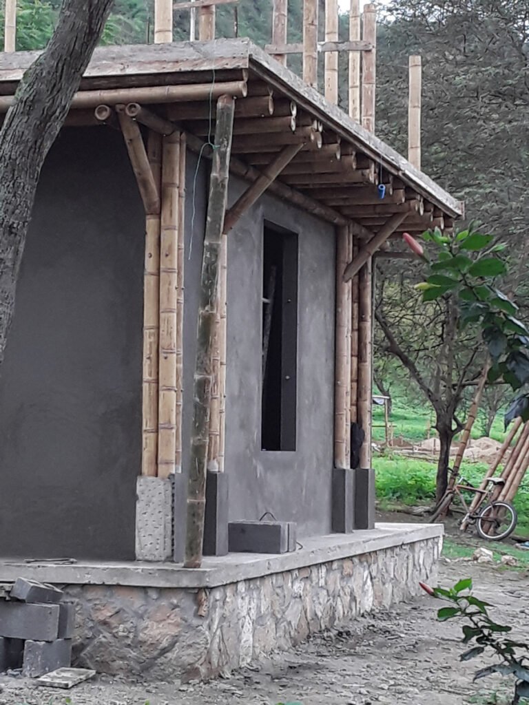 Casa de dos pisos en Bosques de Olón con una estructura de bambú, paredes de bloques (planta baja) y caña picada (segunda planta) enlucido a ambos lados y losas de hormigón armado.